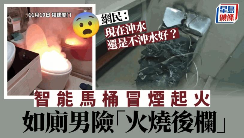 據內媒《揚子晚報》報道,這宗馬桶自燃事故發生在10日,居於廈門的一名男子在家中如如廁時馬桶突然開始冒煙,釀成火情。幸他聽到異響走避及時,才未致「火燒後欄」,但已飽受驚嚇。初步懷疑馬桶因電路起火。