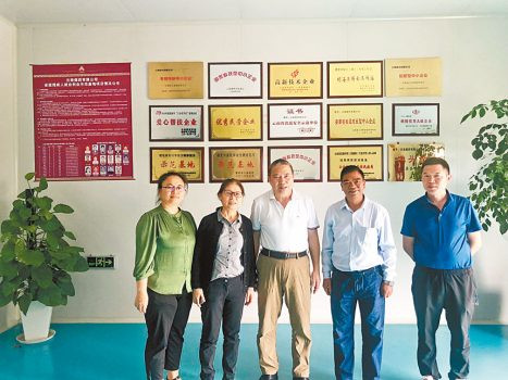 美中經濟文化協會會長李勐(中)、瑞麗市政府三級調研員劉永益(右2)和雲南傣藥有限公司董事長兼總經理丁青(左2)、生產負責人馮祖正(右1)、質量總監趙文梅(左1)在一起合影。