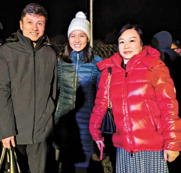 (左起)龍傑、吳弭等在節日點燈現場合影。李强攝
