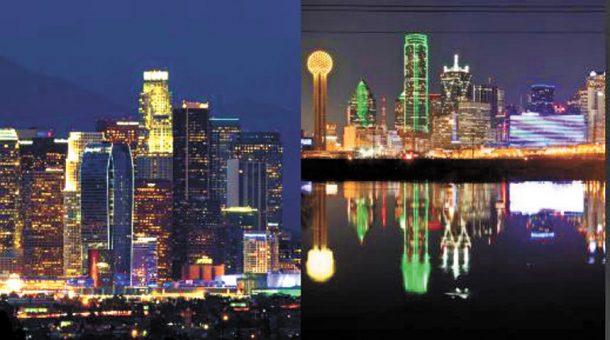 洛杉磯(左)和達拉斯(右)市中心的夜景。美聯社