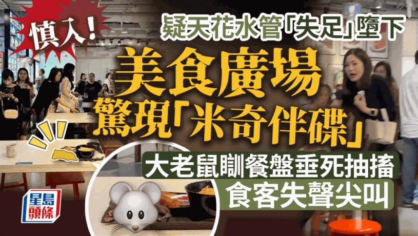 社交平台facebook帳號Tiagong在27日發佈一段視頻,畫面是一個美食廣場之內,鏡頭拉近後,赫然見到一隻黑色老鼠躺在一碗麵和一碟小菜旁,上半身在餐盤外,下半身在餐盤內,狀甚痛苦,四肢多次拍動,似在掙扎,情景嚇人。最初周遭的食客未有察覺,當發現後有女食客嚇得花容失色,然後紛紛響起尖叫聲,亦有不自動退後遠離桌子。