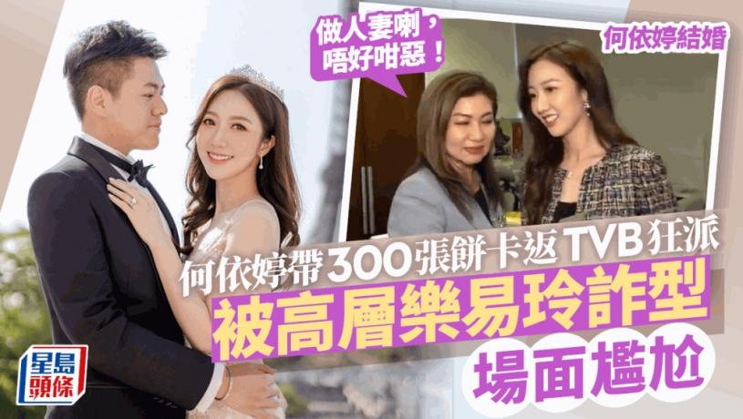 何依婷決定於年底在外地舉行小型婚禮,近日她回電視城「洗樓式」派餅卡,與同事們分享喜悅。《TVB娛樂新聞台》當日現場直擊,首站派發給TVB助理總經理(藝員管理及發展)樂易玲,樂易玲甫見對方便笑着埋怨︰「我預咗啦你唔請我,你唔請我食餅我就會嬲。」一臉尷尬的何依婷即耍冧:「咁你而家唔好嬲啦。」二人相擁後,樂易玲對鏡頭續道︰「恭喜佢!做人妻喇,唔好咁惡、好奸㗎。」何依婷笑稱以後要做「善良角色」來打圓場。