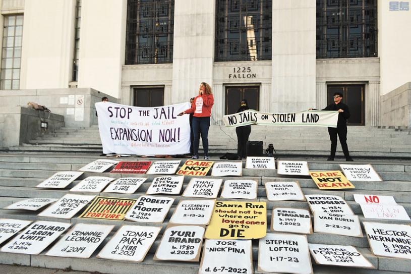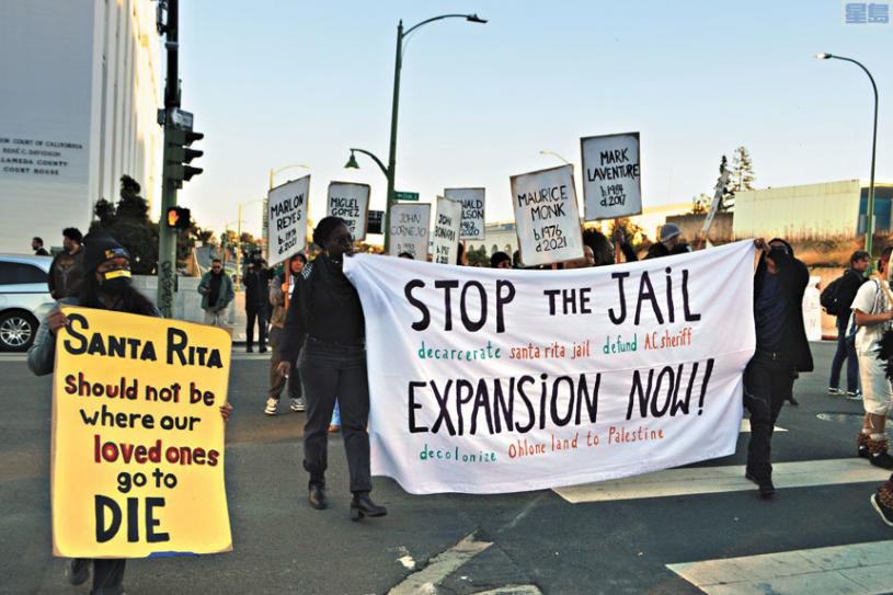 近百名多種族社區成員星期二(28日)下午在東灣阿拉美達縣法院大樓前聚集和遊行,舉牌「在被盜土地上不要設立監獄」(No Jails on Stolen Land)抗議聖他里塔監獄(Santa Rita Jail)的擴建計劃。他們要求立即停止擴建,把資金投入到監獄改造、住房和社區心理健康服務。