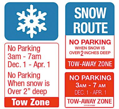 芝加哥市府的冬季禁停路牌有兩種:雪花禁停牌、每天凌晨3時至早上7時期間,無論是否下雪均禁止停車,而每天任何時間段只要積雪超過2英寸即禁止停車。因此駕駛者必須細心看清楚路牌。駕駛者也可以上網查看全市禁停令受到影響的路線(chicagoshovels.org)。