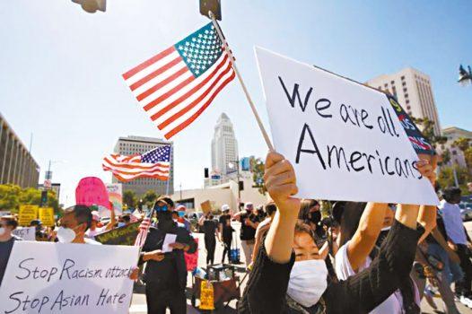 2021年,抗議者在洛杉磯市中心反對亞洲仇恨犯罪集會上遊行。美聯社