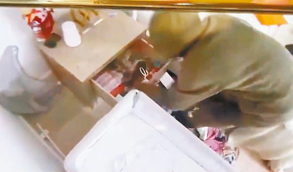 監視器顯示歹徒翻箱倒櫃搜刮貴重物品。KTLA5電視畫面