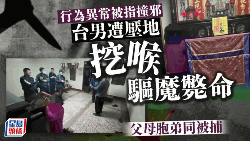 事發在上周五(1日),虎尾大屯一戶民宅內,一家人化身驅魔法師,疑似進行一場驅魔儀式。消息指,28歲陳姓長子,被父母認為其近日的情緒反常行為異常是「撞邪」,於是在家中進行驅魔儀式,全家化身法師,陳男遭父母、胞弟壓在地上,進行「挖喉嚨驅鬼」的儀式,過程中陳男因不舒服,因而不斷掙扎不斷跺腳,但其餘3人並因此未收手。