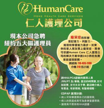 專業家庭護理員24小時陪在癡呆症/失智症患者身邊,就可以讓患者感到舒心安逸,患者有人關懷與陪伴,夜不再漫長,酣然入夢。仁人護理公司 (Human Care Home Health Care Services) 是一所由紐約州衛生局頒發執照的家庭護理機構,仁人護理公司服務區域涵蓋紐約五大區:布碌崙、皇后區、曼哈頓、布朗士、史丹頓島、長島納蘇郡。多年來為無數病患提供優質全面的家庭護理來滿足醫療上和日常生活上的需要,仁人護理公司承諾為被照護者提供專業、愛心和熱誠的家庭健康護理服務,深得社區高度讚譽,有口皆碑。