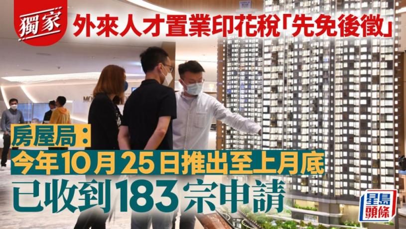 「先免後徵」在10月25日開始實施,房屋局回覆《星島》查詢時表示,截至上月30日,稅務局已收到183宗「先免後徵」的申請個案,反映經優化的「先免後徵」安排深受外來人才歡迎,以及措施在便利外來人才在港置業和吸引外來人才留港發展方面有顯著成效。