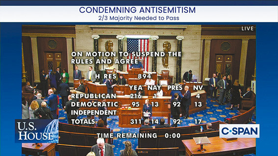 眾議院5日以311票對14票,通過譴責反猶太主義決議案,當中民主黨有92人投「出席」票,13人投反對票,僅有95人投支持票。 臉書圖片