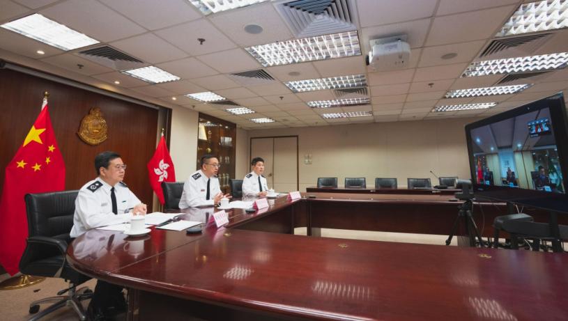 郭俊峯(中)於周一(4日)與各管制站指揮官進行視像會議,以了解區議會選舉投票日的準備工作。政府新聞處