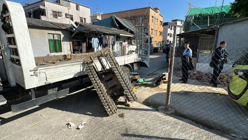 上水東慶路上水圍,今(8日)早上8時28分,40歲姓劉男子駕駛工程車,運載一部小型挖泥機到廖氏祠堂對開進行工程,其間劉站在車斗上操作挖泥機時,挖泥機突失控連人帶車向左翻側,劉腳部被壓,途人發現報警求助。