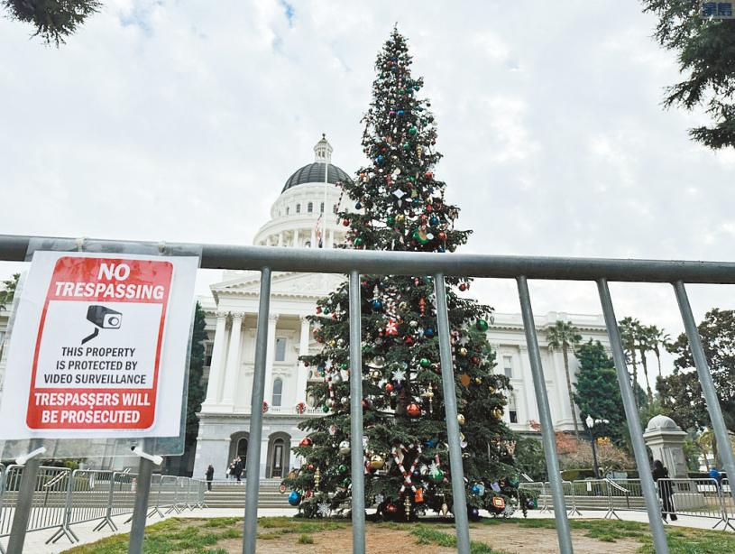 州府聖誕樹亮燈儀式可追溯到1930年代。根據加州高速公路巡警網上張貼的一張許可證,儀式似乎原定於周二舉行。本周州府大樓外的聖誕樹周圍設置了屏障。
