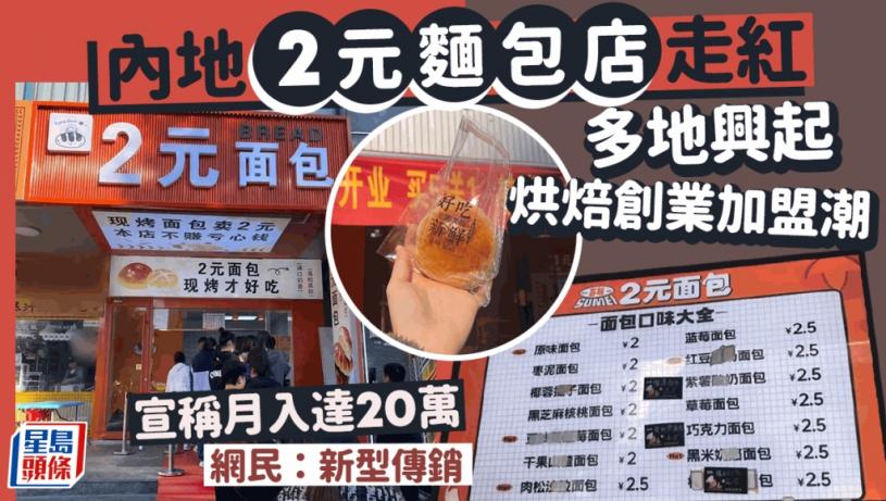 早前「月薪一萬買不起麵包」的話題登上微博熱搜,不少人大嘆麵包越賣越貴,但近日內地掀起一陣「2元麵包熱」。在小紅書、抖音等平台上,諸如「95後寶媽創業開2元店」、「南寧首家2元麵包店開業了」、「2元麵包創業記」、「裸辭開一家2元麵包店」的創業故事越來越多 。一些創業者在社交平台上連載自己2元麵包店開業的全過程,宣稱投資幾萬元就能「月入20萬」的帖子充斥各大社交平台,引起了不少人的投資熱情。不過有人表示「日銷五六千元」、「毛利率在80%以上」的說法,只存在於加盟宣傳文案中,實際運營較難實現,純粹只是另一種形式的傳銷。
