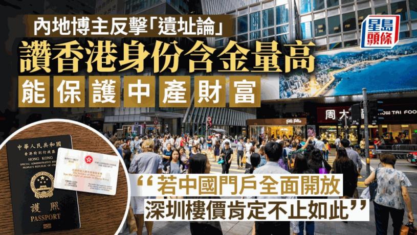 他覺得香港身份的含金量來自於擁有多重福利,包括教育福利好,如果在香港上公立學校,每學期僅需繳納書雜費即可,且升學率高,香港八大高校錄取率30%;加上香港稅制簡單、稅率低,香港沒有重復徵稅,沒有遺產稅、利息稅、資本稅、營業稅、銷售稅、增值稅、贈予稅或資本增值稅。此外,香港人在北京、上海及大灣區買樓有資格優勢的便利,而且香港護照在171個國家或地區免簽等。他認為,多重福利加起來,價值可達1,000萬元。
