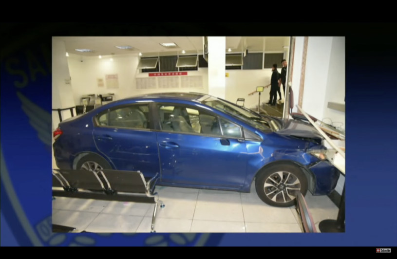 楊駕駛藍色本田撞入領館大廳。三藩市警察局