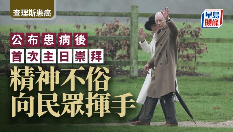 英王查理斯早前確診患癌,查理斯周日前往教堂參與崇拜,是他公布患癌後首次,期間他與卡米拉與民眾揮手致致意。