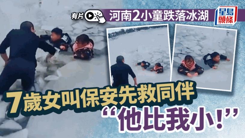 內地不少地方正處嚴寒,戶外河流湖泊結冰,隨時變致命陷阱。河南便有一對小童,在結冰人工湖玩耍時,冰面突然穿破雙雙身陷險境,幸有保安及時發現,不畏危險落湖救人,難得的是遇險的7歲女童,慌而不亂,不斷叫保安「先救他過去,他小」。