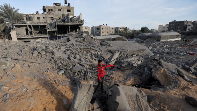 以軍空襲加沙拉法,一名巴勒斯坦青年示意被炸中的房屋。 路透社