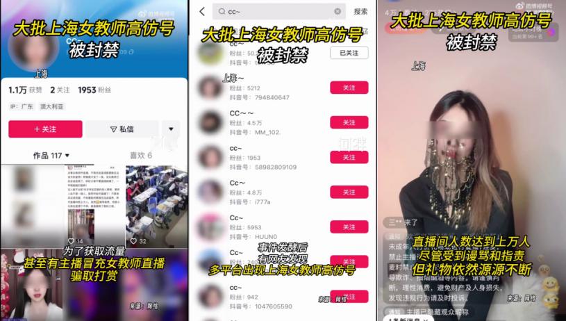 事件發酵後,有網民發現,多個網絡平台上出現上海女教師高仿帳號。為了獲取流量,甚至有主播冒充女教師直播,騙取打賞,直播間人數達到上萬人,儘管受到謾罵和指責,但禮物依然源源不斷。