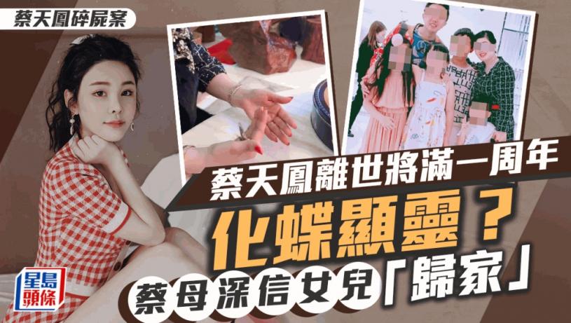 「五姐」續說:「大寶寶(蔡天鳳),媽媽也知道你帶著不捨和牽掛去了天國,妳也知道媽媽時常掛念妳,這段時間家裡出現的事情太神奇了。50幾樓經常飛上來這只蝴蝶,媽媽知道大寶寶顯靈了,化身為蝴蝶魂歸家裡,陪伴家人的左右,也是媽媽的一點安慰。大寶寶4個小寶貝們每星期六日或假期,都聚在一起玩相親相愛很暖心,你要過得好好的,媽媽和親家女婿當4個小心肝們像自己親生骨肉一樣盡心盡力照顧和培養好,大寶寶如果有甚麼心願托夢給媽媽喔!媽媽的大寶寶做人的素養,孝順,做事的文化知識,在所有親朋好友們眼裡人見人愛,我們永恆的思念和牽掛。感謝大家時刻的關心、慰 問和痛心,衷心感謝香港警方不眠不休為女兒昭雪。」