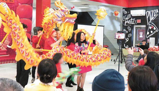 在全場熱烈的氣氛和掌聲中,結束了文藝演出,開始了美食品嘗和文化體驗活動。Chin-Chin Café提供了熱騰騰的飯菜,還有熱心的家長們帶來的點心甜品和飲料。猜謎、寫福字、夾糖豆、做紅包燈籠、做手工小龍,活動豐富而有趣。師生家長們談笑歡顏,吃得開心,玩得愉快。很多人還在舞台中央和金龍合影,留下了龍年的美好瞬間。本報華盛頓訊