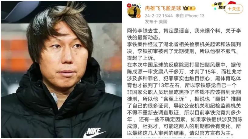 根據網民提供的截圖,冉雄飛在原貼文中提到,本次中國足球的反腐除惡打黑掃賭風暴中,據傳中國足協原主席陳戌源一審貪腐8000多萬(人民幣,下同),才判了15年;而中國國家體育總局原副局長、中國足球協會原黨委書記杜兆才涉及多種罪名,也才被判了13年左右;所以李鐵感覺自己一個非國家公職人員不應該得到無期徒刑,所以他「含冤上訴」。