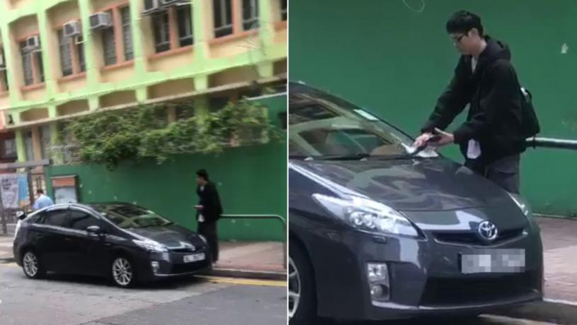 網上今日(24日)流傳一段短片,可見元朗安信街一名黑衫男子,站在停泊路邊私家車旁,及後再將紙張放在車頭擋風玻璃位置,引起網民熱議。據了解,該名黑衫男子為元朗警區軍裝巡邏小隊成員,當時他身穿便裝,揹着打印機,與軍裝同袍於現場打擊交通違規。期間,軍裝同袍在學校對開發現有私家車涉嫌違泊,遂用手機抄牌,及由片中便裝警負責打印告票,夾於車頭位置。
