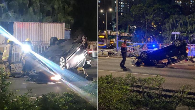 今日(24日)下午8時許,將軍澳寶林北路近魷魚灣村道位置,一部私家車失控撞向交通燈柱,再翻側四輪朝天。事件中交通燈柱被撞斷,現場滿地殘骸;至於65歲男司機則腳部受傷,救護車到場後將他送醫院救治。意外原因仍在調查。
