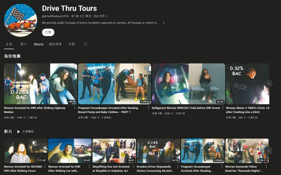 「Drive Thru Tours」頻道多次上傳女性被捕影片。 網站截圖