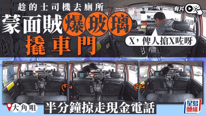 事發於昨日(26日)下午2時許,網上流傳片段所見當時的士停泊於路邊,車來車往,其後蒙面賊靠近的士副駕位,用硬物爆玻璃撬開車門。其後賊人隨即搜掠的士司機背囊,又將擺放車頭的三部電話盡數偷走,得手後關上車門逃之夭夭。