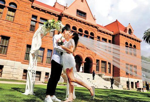 於2022年2月22日在聖塔安納登記結婚的新人Lu Zheng與Laura Li。洛杉磯時報