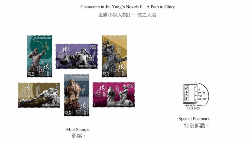 2024年是查良鏞博士(金庸)百年誕辰,繼2018年發行「金庸小說人物」特別郵票後,香港郵政於今年再度以「金庸小說人物II──俠之大者」為題發行一套6枚郵票、3張郵票小型張及相關集郵品;3月14日(星期四)推出發售。