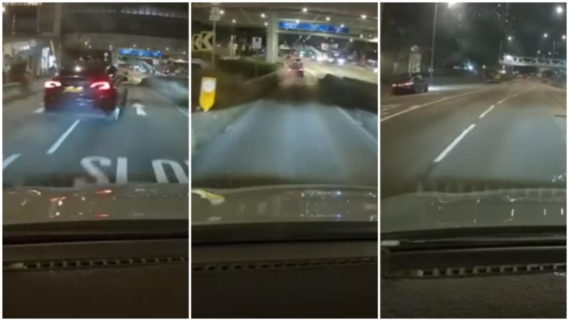 惟該私家車疑衝得太猛,先撞左壆擦出大片沙塵,再撞右壆,似打「士碌架」,幸未見反車,仍盲衝前約百米,最後停在形點一期商場前的巴士站。片段中的男司機及兩名女乘客目擊整個過程,不時發出嘩嘩聲,有女乘客見私家車左搖右擺揶揄說聲「Bye bye」,另一名女乘客則嚇得「仲乜事啊」,男司機亦忍不住說「黐線」,片段上載後引來熱議,有網民估計兩車正在非法賽車。
