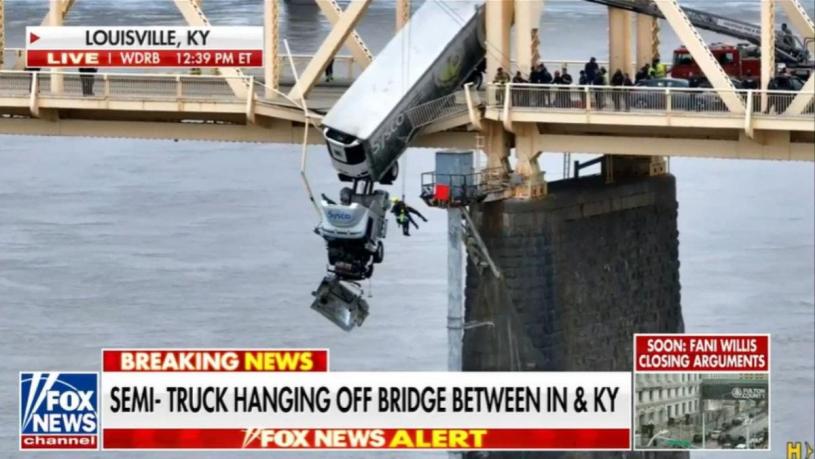 綜合美聯社、網站Medriva與英國《每日郵報》報道,事發在連結肯州與印第安納的喬治羅傑斯克拉克紀念大橋(George Rogers Clark Memorial Bridge),3輛車在1日中午接近12時相撞,其中1輛卡車衝破護欄,前半部分懸掛半空,與冰冷的俄亥俄河(Ohio River)相隔80呎,就在民眾提心吊膽之際,幸而救護人員及時趕到。