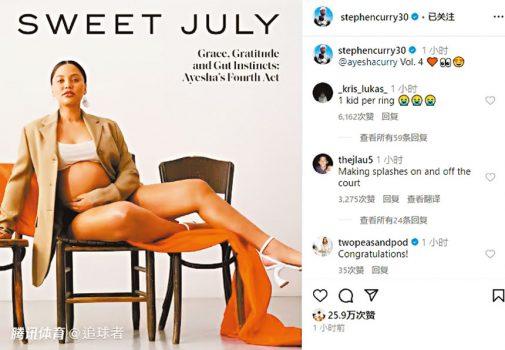 阿耶莎當日在自己創辦的雜誌《Sweet July》中宣布自己已經懷有第四胎,一系列的懷孕照曝光,在雜誌封面的懷孕照上寫著:恩典、感激與對新生命的感知——阿耶莎的第四胎。隨後庫里轉發阿耶莎的懷孕照,正式宣布他即將迎來第四個孩子的喜訊。值得一提的是,快船球星威少第一時間為庫里點讚。
