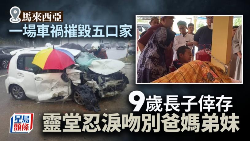 馬來西亞上周六(2日)發生一宗奪命車禍。事故將一個五人家庭摧毀,全車只有9歲大兒子倖存。事發後,男童在親友陪同下出席葬禮,並強忍著淚水與爸媽弟妹遺體吻別,抽泣地訴說心中思念,「我們天堂再聚,你們別再丟下我,好嗎?」場面讓人心酸。
