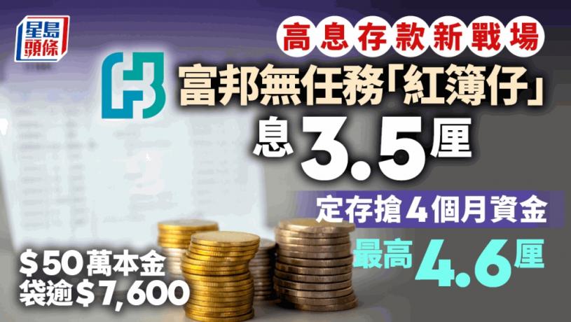 多家銀行近期再加存息搶錢,戰線由定存打入活期存款,甚至毋須做任務,在「紅簿仔」息率一較高下。富邦推出新資金額外活期利率,可享高達3.5厘,較傳統大行的0.875厘高出一截。另外該行亦與工銀亞洲掀起4個月定存戰,最高有4.6厘,50萬元本金可袋7,666元利息。