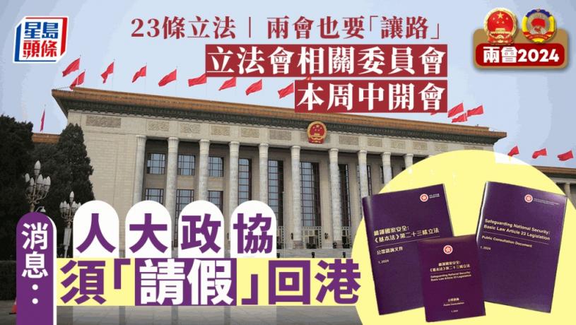 《基本法》第23條立法公眾諮詢上月底結束,保安局收到約1.3萬份意見書,當中近99%表示支持,當局表示會全速整合諮詢結果,向立法會保安事務委員會及司法及法律事務委員會聯席會議匯報。據悉,23條相關會議定於本周三(3月6日)舉行,多名身兼港區人大、政協委員的立法會議員正在北京開會,他們今日(5日)出席全國人大會議開幕式後「請假」,返港出席會議。