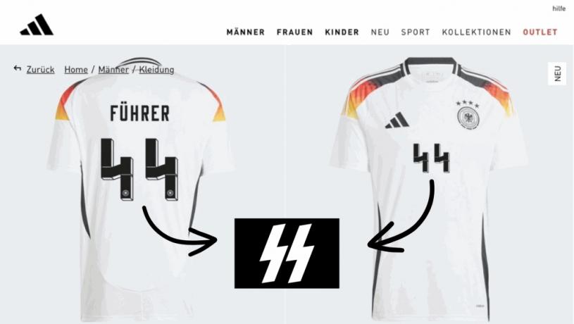德國足總早前宣布與長年贊助商Adidas結束合作關係,2027年起轉用Nike引發批評後,球衣設計又釀風波。有網民發現新設計的德國足球國家隊球衣,如果自訂號碼製作44號,成品效果似納粹黨衛隊「SS」標誌。Adidas隨即宣布禁止球迷自訂44號球衣,並承諾會更改字體。