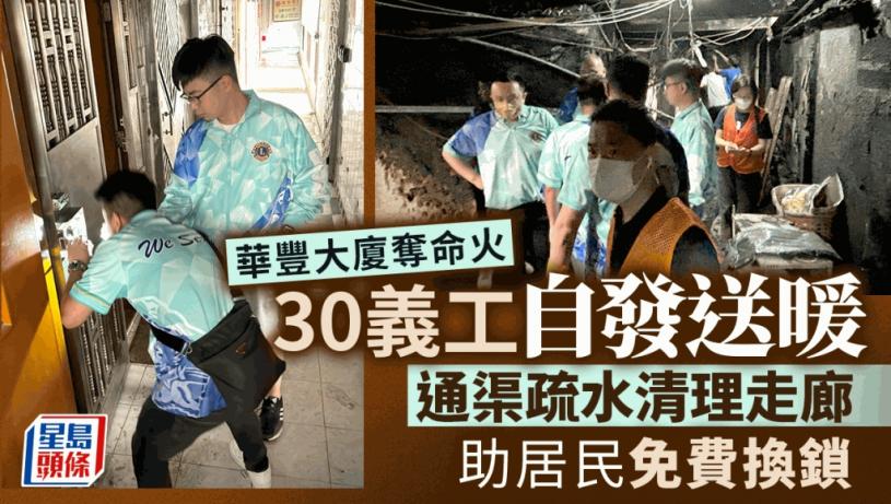 佐敦華豐大廈周三(10日)發生5死40傷的三級大火,一、二樓火場曝光,現場走廊嚴重熏黑,浸着污水,頹垣敗瓦,滿目瘡痍,天井雜物亦告焚毀,居民飽受痛失家園之苦,重建家園亦是漫長道路。有不少民間團體雪中送炭,自發性今日到災區現場,協助居民解決燃眉之急。其中家居維修義工協會及獅子會義工,登樓檢視災後情況。協會會長陳先生表示,暫接獲約20宗求助,大多為長者或行動不便不能上樓的住戶,協會義工會為他們免費換鎖,或進行簡單的家居維修。