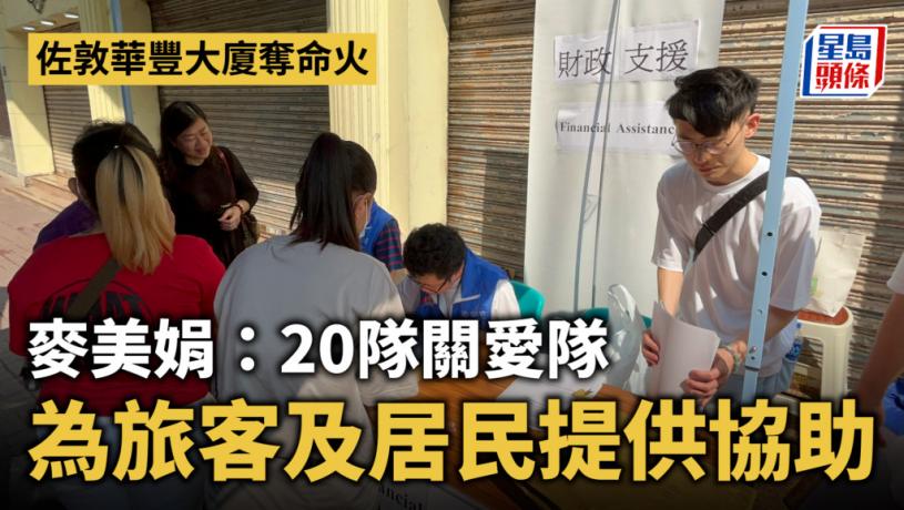 佐敦道華豐大廈造成5死的三級火。民政及青年事務局局長麥美娟表示,事發後已即時動員油尖旺區20隊關愛隊,為華豐大廈內的賓館旅客及居民,提供協助及支援。