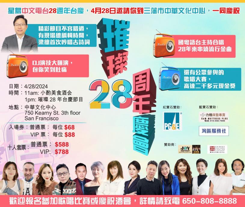 4月28日,帶上你的歡笑和熱情,來三藩市中華文化中心(750 Kearny St. 3th floor, San Francisco)參加「璀璨28週年慶會」,讓我們一起慶祝這個特別的日子!