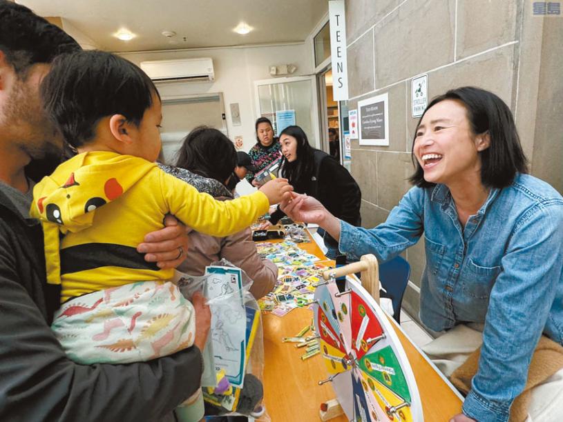 第一區市參事陳詩敏當日在列治文區圖書館與民同樂,主持有獎遊戲,並向孩子們派發禮物。