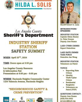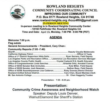 4月15日晚7點,位於羅蘭崗社區中心,講座主題是社區犯罪和鄰里巡邏。4月17日下午1:30,位於El Monte的安博空間,講座主題是貨櫃盜竊現況和預防措施。4月25日下午6點,位於哈崗社區中心,講座主題為社區安全、網路詐騙、仇恨犯罪。