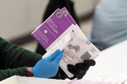 洛縣選務工作人員檢查郵寄選票上的簽名。美聯社