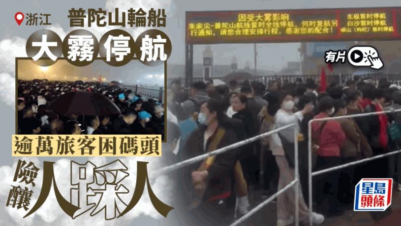浙江舟山普陀山景區,上周六(13日)出現濃霧,令所有進出普陀山的輪船全部停航,有逾萬旅客滯留離島,擠在碼頭外,一度有人指逼到窒息,部份人難忍擠壓,攀越圍欄進入尚未啟航的碼頭,有旅客表示被困近2小時,才能登船離開。