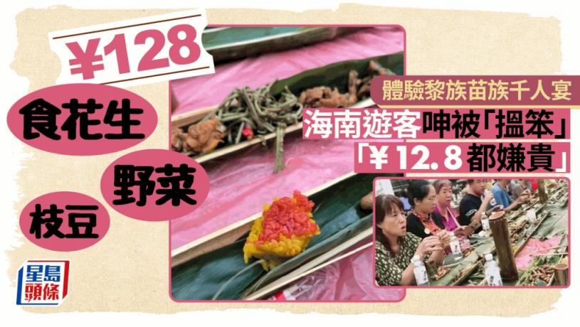 內地有網民日前上傳「花錢體驗千人宴」短片,表示到海南保亭參加黎族苗族慶祝傳統節日「三月三」的慶祝活動,花了128元當地的特色「千人宴」,與其他旅客坐在特大長桌上,享用放在竹筒上的美食。
