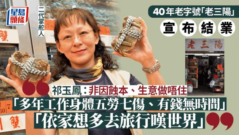 「老三陽」以售賣嘉湖糭及江蘇大閘蟹聞名。祁玉鳳憶述,自17歲起睡在貨車與父親一起「打天下」,形容工作異常辛勞,沒有年輕人會願意接手,直言「一年365日我做足362日,日日做16個鐘,大閘蟹旺季嘅時候,我通宵運作直踩30幾個鐘。」