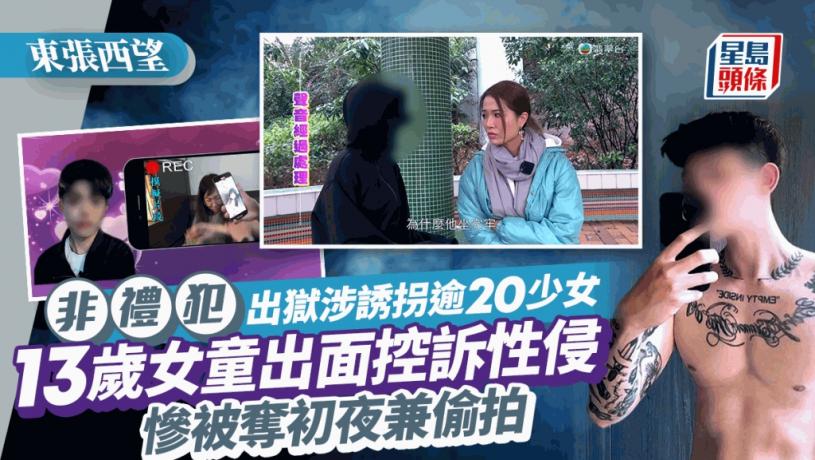 TVB節目《東張西望》昨晚報道一名曾犯非禮案的紋身男,出獄後「改頭換面」變成寵物KOL,設陷阱誘騙少女到家中侵犯,受害人數更多達逾20人。多位受害人向《東張》投訴,當中更涉及年僅13歲的少女,受害人遭偷拍性愛片,更懷疑非禮案紋身男疑似播播性病。